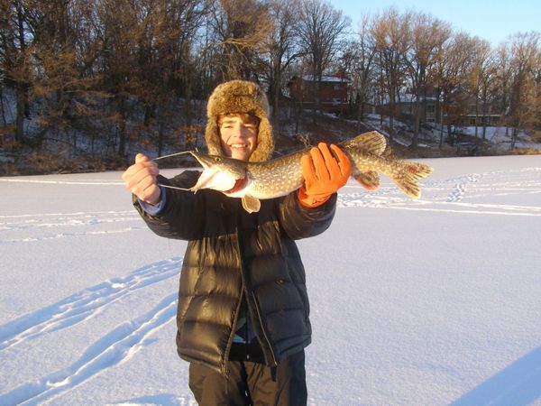 Už jste někdy v zimě rybařili? Já jsem vlastně poprvé ryby chytal až tady na jezeře Long Lake (asi 20km od Rice Lake, kde s rodinou Generouxových letos bydlím), ale nestačil jsem se divit: nejdřív postavit stan, zatopit v něm speciálním hořákem, abychom při teplotě -20°C neumrzli, pak speciálním vrtákem vyvrtat v ledu několik otvorů (nejlépe před sousedovým domem, protože před naším se bruslí…), ponořit návnadu a čekat, až zavlaje některý z praporků, jakmile návnadu ochutná nějaká ryba. Věřili byste , že mým prvním životním úlovkem byla úžasná velká štika? Byl jsem nadšen!! To jsem ale ještě nevěděl, že žádná obyčejnější ryba v našem jezeře nežije, takže jsem obrazně řečeno ani nic menšího chytit nemohl…