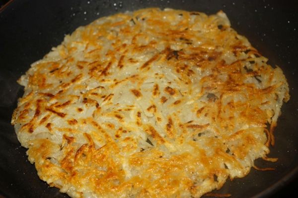 Pak jde vše bleskově; brambory nastrouhejte na hrubém struhadle do mísy a po chvíli vytlačte přebytečnou vodu. Osolte, opepřete a rukou vmíchejte česnek a slaninu. Pak už jen opečte asi centimetr silnou bramborovou vrstvu dozlatova z obou stran. Alespoň tak to tady dělá moje americká mamka. Doporučuji podávat se smaženými vajíčky a nějakou zeleninou.